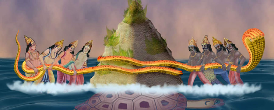 Image 5: The Churn of The Ocean of Milk: Where the demon Rahu was deceived by the devas thus resulting in Rahu forever seeking revenge on Chandra and Surya.