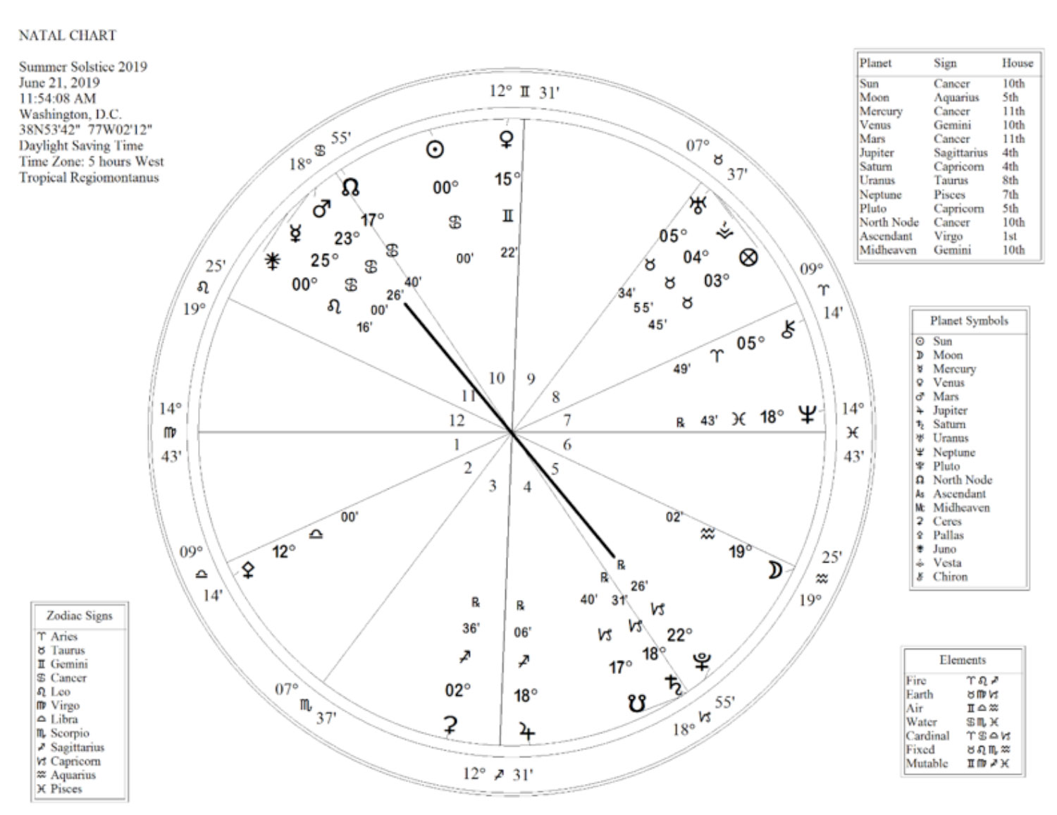 After the general principles of the fork for a season, Ohm, Sun and Zodiac, specific planetary influences based on the chart calculated for the exact movement of the Sun across 0’ 00’ at the tropic of Cancer. The chart for the 2019 Summer solstice is calculated for June 21, 2019, at 11:54am in Washington, DC. (see Figure 3)