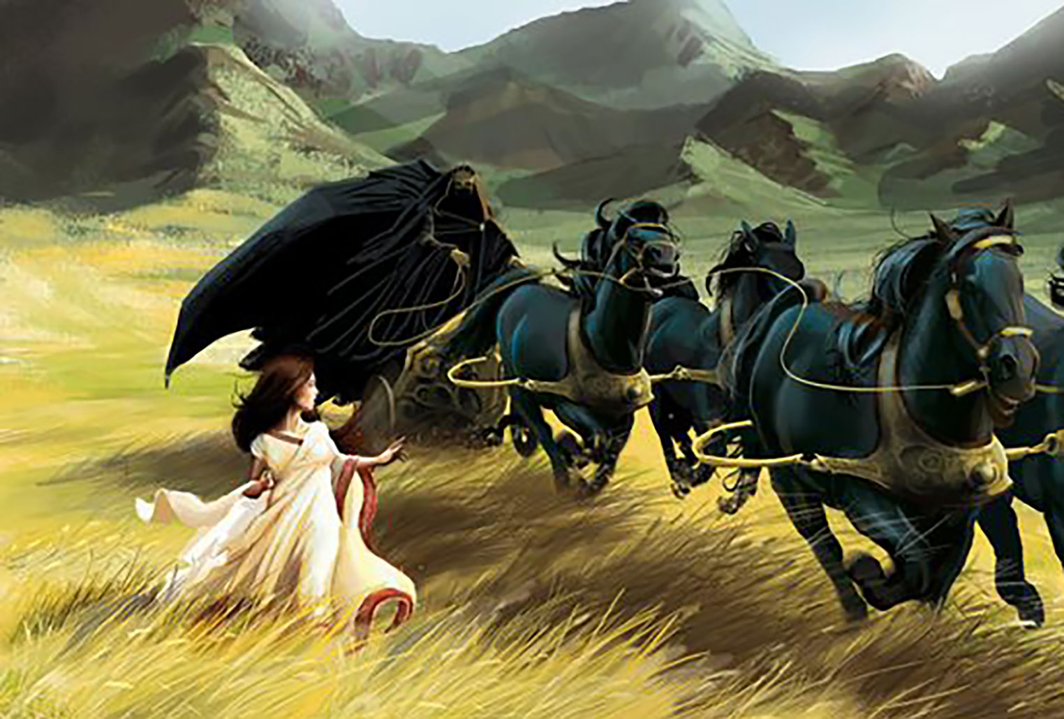 Demeter (The Goddess of all things that grow on Earth) has a deeply nurturing, loving and protective relationship with her beautiful daughter Persephone. As Persephone starts to blossom into a young woman, her Father Zeus convinces Demeter to loosen her defensive guard and allow Persephone to venture out with her friends one fine Spring day. Violently, the Earth erupted into a chasm and Hades, the Lord of the Underworld, reached up and grabbed the fair maiden’s ankle. He dragged her down into the land of shades upon his chariot led by his eight powerful black stallions. They descend deep into the Underworld as the Earth clamps shut with no trace left behind.