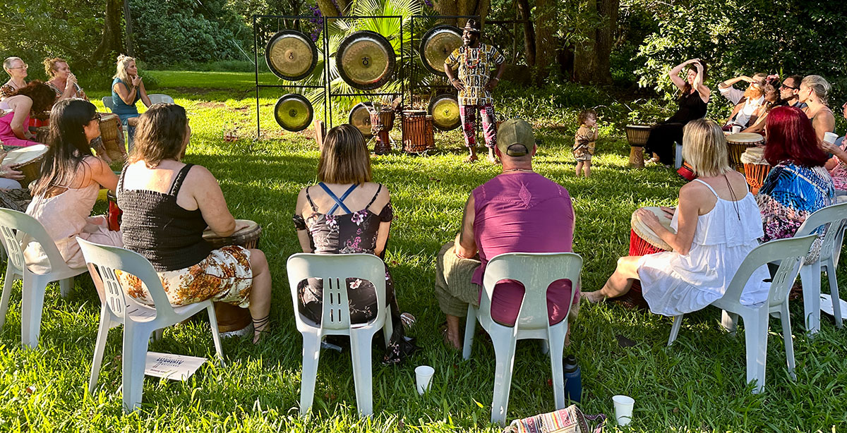 On Sunday afternoon we met at a stunning iconic venue in Byron that has a large open outside space underneath massive fig trees and a very cute church hall. We began with a smudge and didge ceremony taking a moment to connect to country and reflect on their personal journey through the Acutonics program. Then they each received their certificates and had the opportunity to share with the group, which included fellow students as well as loved ones who were able to be present for this celebration. After the formal presentation we all shared in a super fun connective experience, a group drumming workshop from a local African percussive teacher. The final celebration included a catered dinner and entertainment from a great African dance music band, Happy Africa. And dance we did!