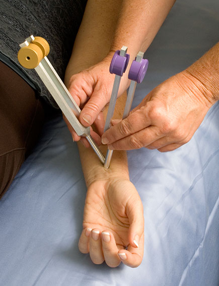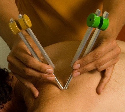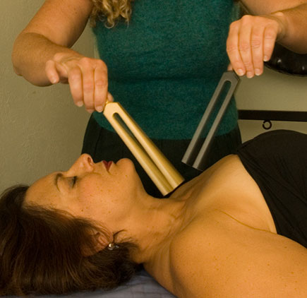 Following our intake assessment, the client relaxes on a massage table and can remain fully clothed if he or she chooses. The tuning fork is first struck against an Acuvator®, and then placed on the body or held near the ears. The fork’s sound waves