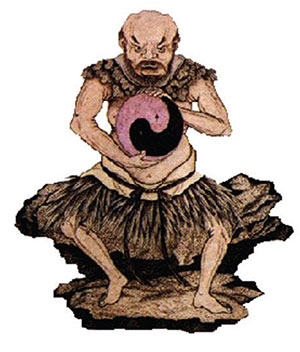 Before the beginning of time, before heaven and earth, there was nothing, and out of this void a great cosmic egg emerged. Floating within the sea of chaos was a divine embryo, as yet unformed, who came to be known as P’an Ku. For 18,000 years P’an Ku, protected by this cosmic egg, floated in a chaotic primal sea, maturing and becoming. When he was ready, his generative cycle completed, from within the egg he uses a hammer and chisel to free himself. As the egg split apart, one became two, all that was high and clear was sent above to form the heavens and all that was dark and turbid was sent below to form the Earth. And there between Heaven and Earth stood P’an Ku hammer and chisel in hand. Legends tell us that his body transformed nine times daily, while the pure dome of his head supported the Heavens and his feet brought stability to the Earth. If you could have looked upon him you would have seen a great and mighty creature covered with hair, with two great horns on his head, and two tusks protruding from his lower jaw. For another 18,000 years, P’an Ku chiseled the Earth and Sky apart. He worked tirelessly, as each day Heaven increased ten feet in height, Earth grew ten feet in thickness, and P’an Ku grew ten feet in length. This was exhausting work for P’an Ku, and it is said that when he wept his tears became the Yellow River. Once the Earth and Heaven were in their proper place, P’an Ku, the first great creator, knew that it was time to complete his work. His expansive growth, length after length, served a divine purpose. At last, he was ready to perfect the Universe. As he lost physical form, (some might call it death), he brought life to the Heavens and the Earth. His flesh formed the soil of the fields, and his limbs marked the four directions, while his body also formed the five sacred mountains of China. To the East the T’ai Mountains were formed from his head; in the West from his feet the Hua Mountain formed. The North and South Heng Mountains were formed from his right and left arm respectively. In the Center, from his trunk emerged the Central SungMountain. It is from his bones and marrow that all the rocks, metals, and precious stones came forth. From his blood the rivers and seas, and from the thick hair that covered his body all the trees, plants, and vegetation of the Earth burst forth, rich and green. His breath became the wind, his voice created the thunder and his beard made all the great constellations of the sky. From his right eye came the moon, and his left eye, the sun. And from his saliva and the sweat of his hard working body came the rain. Lastly, mankind was formed from the vermin that covered his body. So we see how from the one, the sacred egg, the two came forth to form Heaven and Earth. The heaven the earth and P’an Ku represent the three from which all of creation is formed.[14, 16, 17] Just as P’an Ku brings forth the Sun and the Moon of equal stature so too the Earth and Heavens are equal, and P’an Ku resides in the Middle, neither male, nor female representing all of humanity.