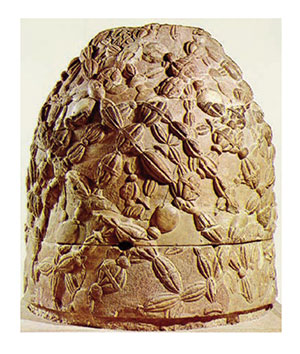 The omphalos, home to the Python, was built in the shape of a beehive. The beehive is culturally significant as the bee is seen as a symbol of the Goddess, and it is the female bees that build the hives and make the honey. A Minoan Seal Ring, from approximately 1500 BC, shows the image of the Bee Goddess. The beehive is also the shape of clay ovens, still used to this day around the world, and seen in our own neighborhood in Northern New Mexico. Jung associated the Mother Archetype with ovens, cooking vessels, and other hollow objects that mirror the shape of a woman’s uterus.[19]