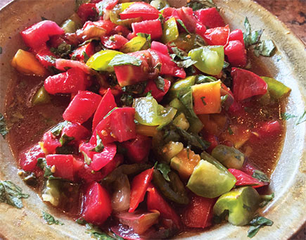 This salad is simple to make and a welcome treat on those hot, late days of summer. Chop tomatoes into chunks, using a mix of colorful varieties. Include red, pink, purple, green, and yellow tomatoes, if you are fortunate to have so many varieties.