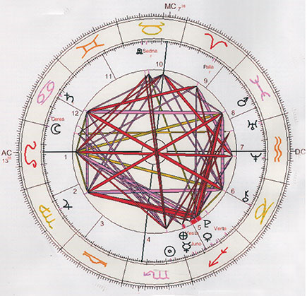 It manifests a grand sextile in water and earth (Sedna,Mars, Chiron, Sun, Jupiter, and Saturn are involved), both by sign and house; in other words, the planetary “players” are located not only in water and earth signs, but also the water and earth houses (2, 4, 6, 8, 10, 12). A grand sextile appears as a Star of David against the backdrop of the heavens, and traditionally this would be considered a configuration of great significance and potential benefit. Sextiles, which are 60 degree aspects, are considered to relate to opportunity; hence, a grand sextile might, in simple terms, be considered representative of a “huge” opportunity. We should note, however, that, in this instance, both beneficial planets (Venus, Jupiter) are overshadowed by malefics, planets inimical in their effects, Venus by Pluto,Mars by Jupiter.