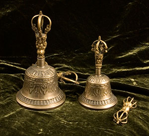 The bell and dorje are used in Buddhist ceremony, and symbolize the duality (yin and yang nature) of life. In Shamanic traditions, the sound of the bell represents the element of air, the realm of the spirits, and the ether that transmits and is the transmitter. In contemporary healing practices, the bell can be used over the chakras or in the etheric field, and is sometimes rung over a singing bowl.