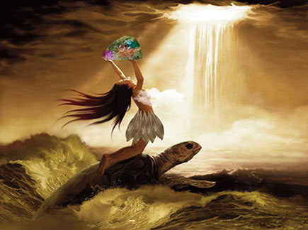However, in the earliest creation myths from China, Nü Gua is an independent powerful goddess, the creator of humankind. She is a matchmaker, bestows fertility, invents sound and music, and brings harmony to heaven, earth, and humanity. She is a benefactor to people and all living creatures. However, just as we see in the West, the power of the strong female creator Goddess is diminished first by pairing her with a male God, and finally by attributing all of her creations to a male God who usurps her power. One example would be the legends of P’an Ku, the male Titan who splits heaven and earth and creates the world and humans from his own body.