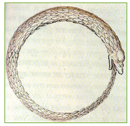 Images of the serpent arise with the development of consciousness and the need to understand our origins. The heavenly serpent or uroborus, the circular snake biting its own tail, is an ancient symbol found in Egypt, Babylon, Phoenicia, India, Mexico, and in Navajo sand paintings. Erich Neumann (1954) identifies the uroborus as the round container, the maternal womb, the Great and Good Mother who provides nourishment, protects, and comforts. It is the union of masculine and feminine, “above and below, male and female, heaven and earth, God and world reflect one another and cannot be put apart” (p. 18).