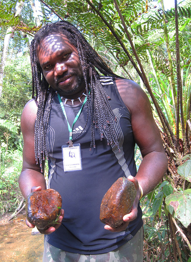 Where I come from in Brasil, we use vibrations to tell us where we have problems in our bodies. We wade into a stream or pond holding two rocks like these, one in each hand. When the water covers most of our body, we strike the two rocks together in the water, and this creates vibrations that the body absorbs where a problem exists. The vibrations go straight to those areas and you can feel them being taken in. I have problems with my legs from an old injury, and that’s where the vibrations go when I strike the rocks. The vibrations help heal the parts of the body that are weak.